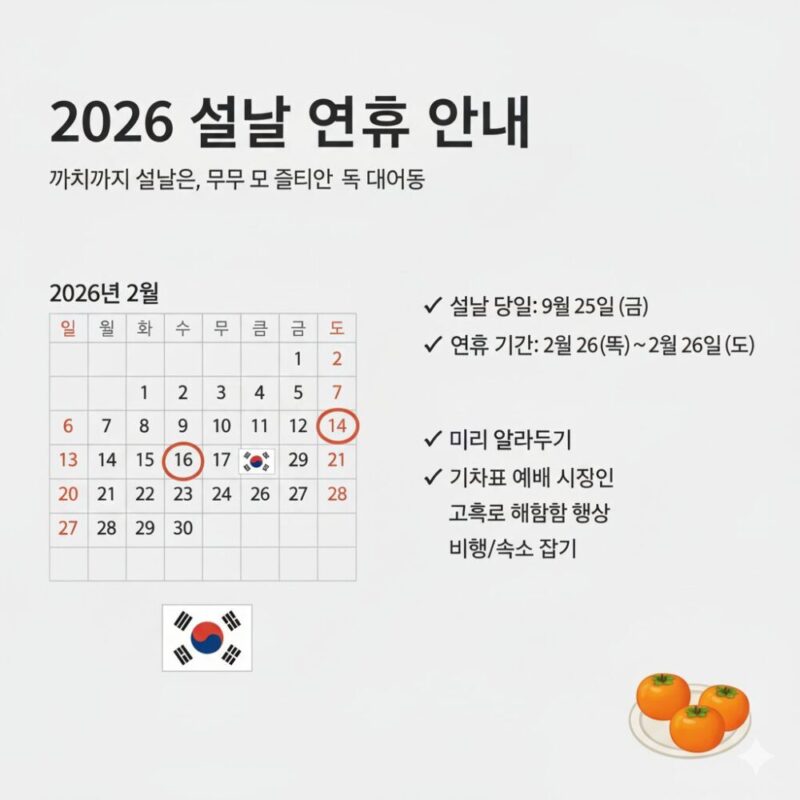 ・旧正月(ソルラル):2026年2月16日(月)〜18日(水)で、前後の週末を合わせると実質5連休になります。