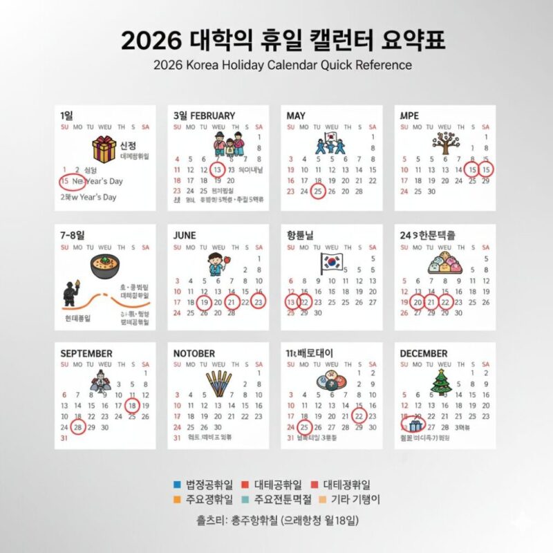 最後に、2026年の韓国祝日を一目で確認できる早見表を用意しました。旅行やイベント計画の参考にどうぞ
