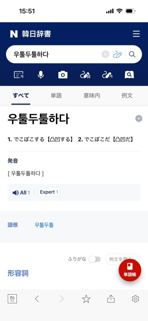 韓国語ー日本語辞書(韓国語学習者向け)を選択後、
