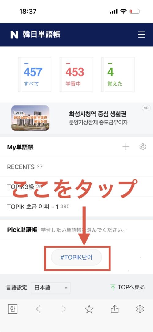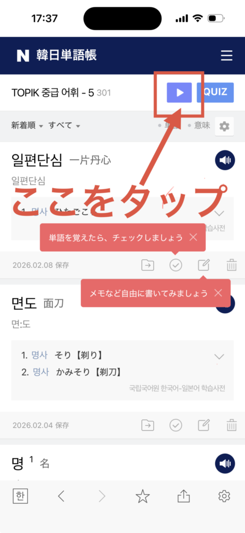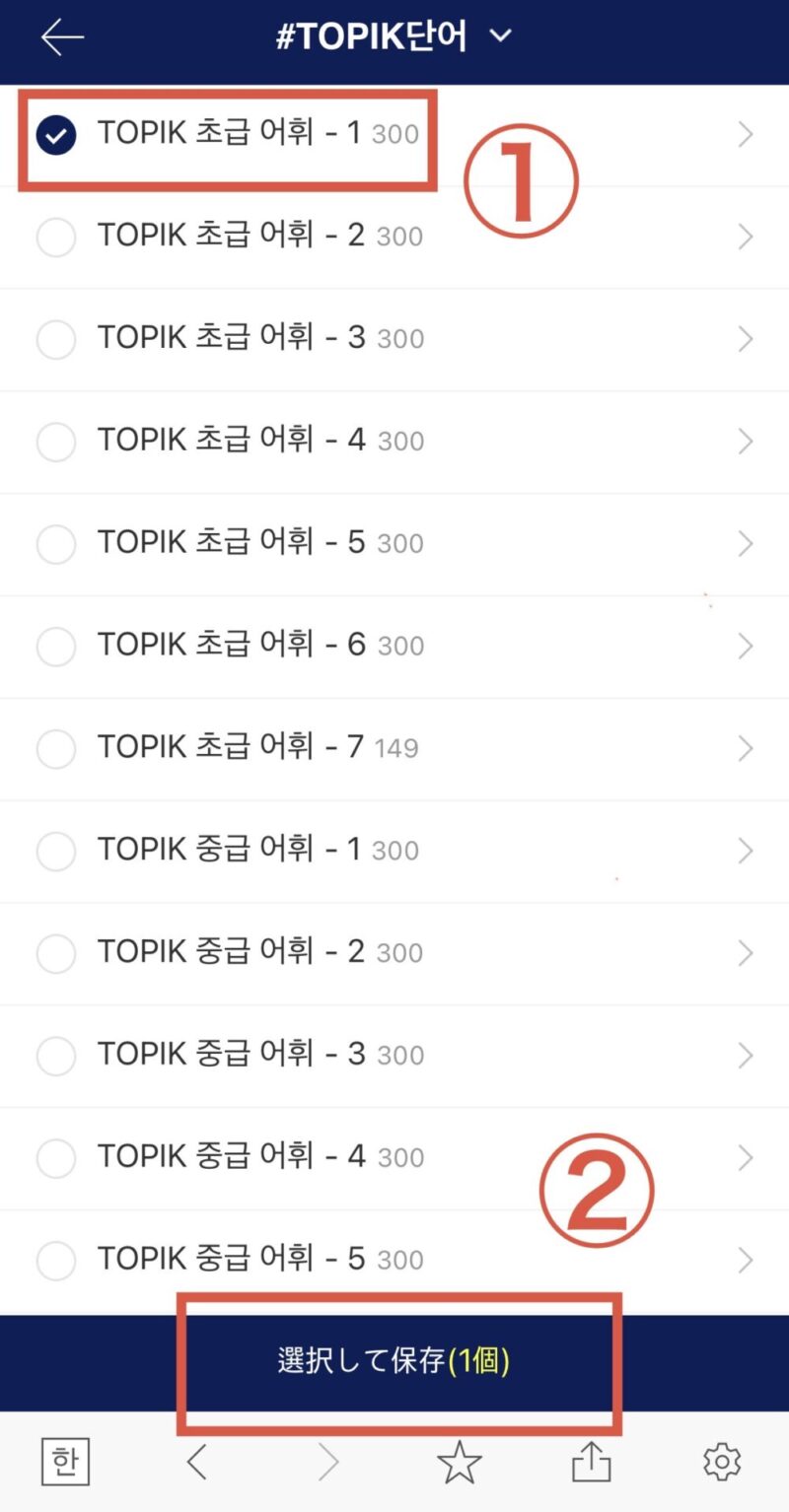 TOPIK単語リストをタップしないと何の単語が書いてあるのか分からないので、