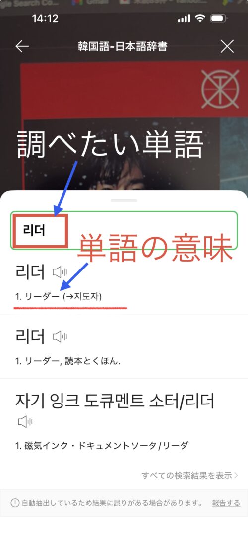 5.日本語または韓国語の意味が表示されます。