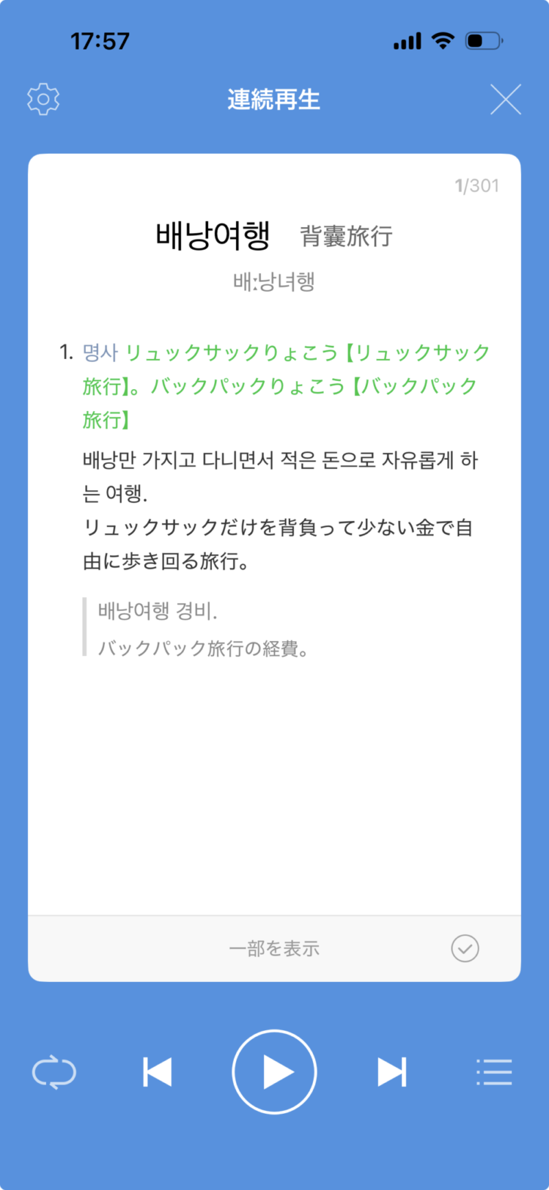 単語と例文をタップすると下のような画面になります。